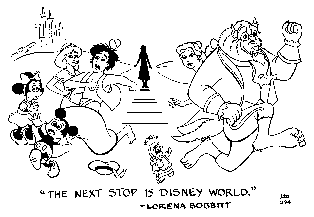 As you may have heard, Lorena Bobbitt has just been released from the mental hospital to which she was sent after being found not guilty of malicious wounding by reason of insanity. (In case you haven't heard, malicious wounding here means cutting off her husband John's penis last June.) And like every other American celebrity, she announced that she'd celebrate by going to Disney World! (Yes, she really did say that.) However, not everyone was thrilled with this news. In fact, the male walkaround characters there wasted no time in heading for the hills upon getting word, as this picture (630x437x2, 12028 bytes) clearly shows.