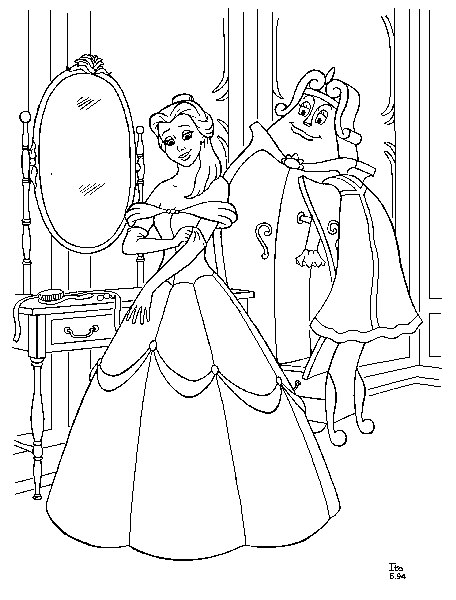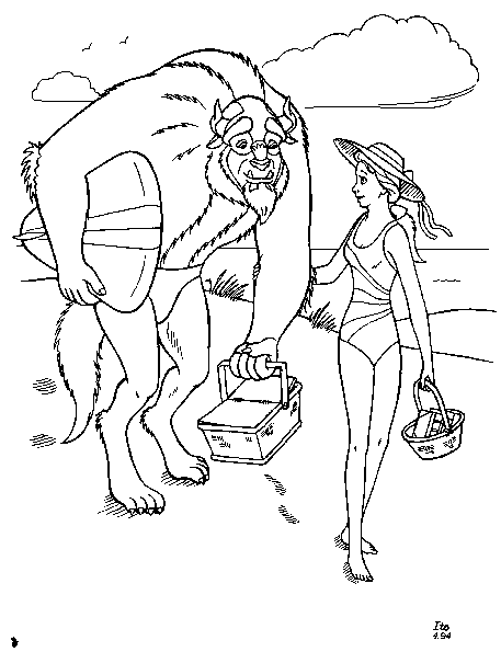 Those of you familiar with Bob's drawings know that he likes to create "what if" scenes with his favorite Disney characters. What if Belle was born a mermaid? ("Belle as Mermaid", bellemer.gif) What if Belle had posed for the Mona Lisa? ("Mona Belle", monabelle.gif) What would Belle and the Beast look like on their honeymoon in Hawaii? ("Beauty and the Beach", batbeach.gif) This drawing continues that tradition. Suppose Beast had learned when Belle's birthday was, before he gave her his library? Here, we see what a hypothetical scene from the movie might be like had this occurred...