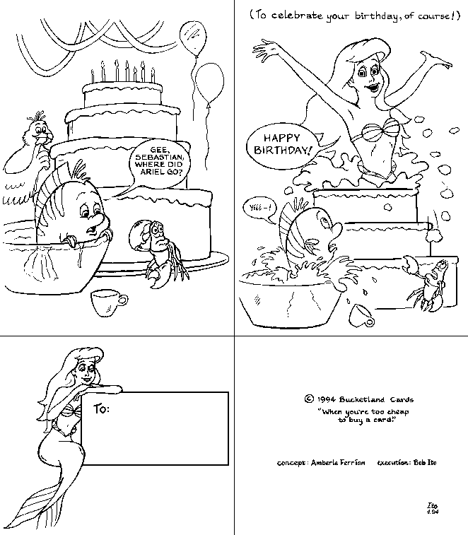 Bob would also like to say that he's not entirely happy with the way Ariel turned out here, but unfortunately we were in a hurry. Bob drew the card a month before Tim's birthday, and while that may seem like a lot of time, bear in mind that we all had to sign it, so the card had to literally circle the United States before it could go overseas to Tim. Fortunately, he got it just in time.