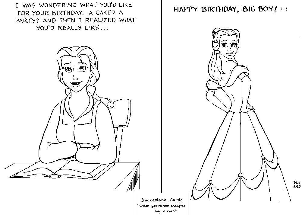 "Belle's Birthday Surprise #1" (belbday1.gif, 592x761x2, 15119 bytes) is the 40th in a continuing series of fine Disney fanart drawings by Bob Ito <ito@[...]> and the 16th in the so-called "Bucketland Cards" series of handmade greeting cards, "when you're too cheap to buy a card." :-)