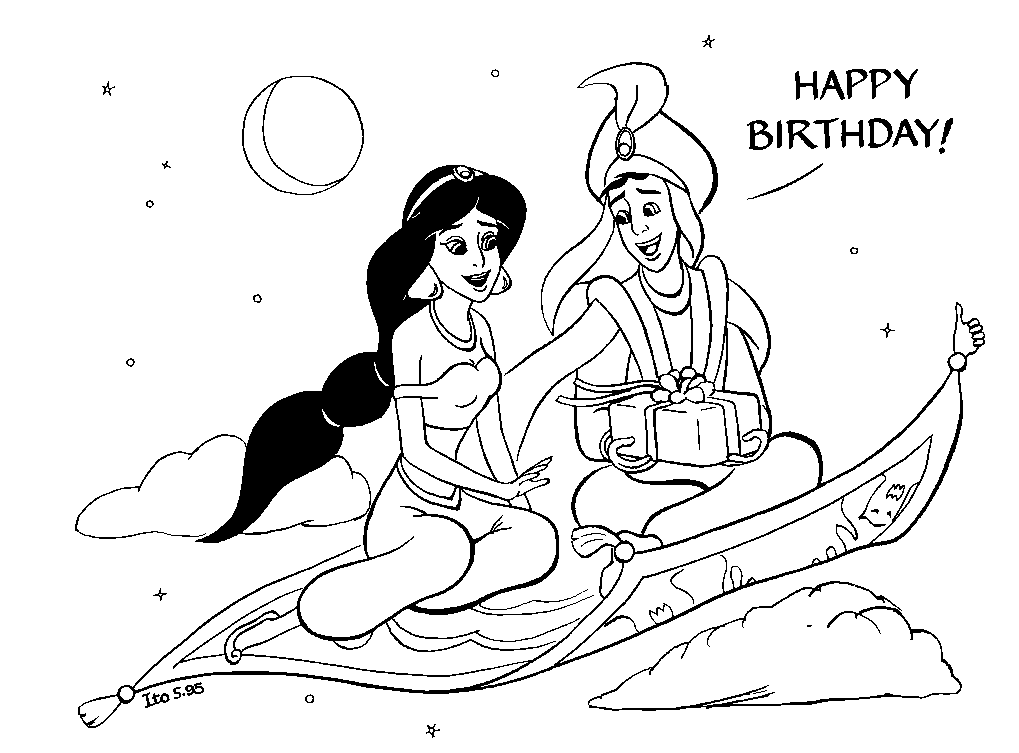 "Aladdin's Birthday Surprise for Jasmine" (1019x753x2, 19085 bytes), is the 45th in a continuing series of fine Disney fanart drawing by Bob Ito <ito@[...]>, and the 20th in the so-called "Bucketland Cards" series of handmade greetings, "when you are too cheap to buy a card."