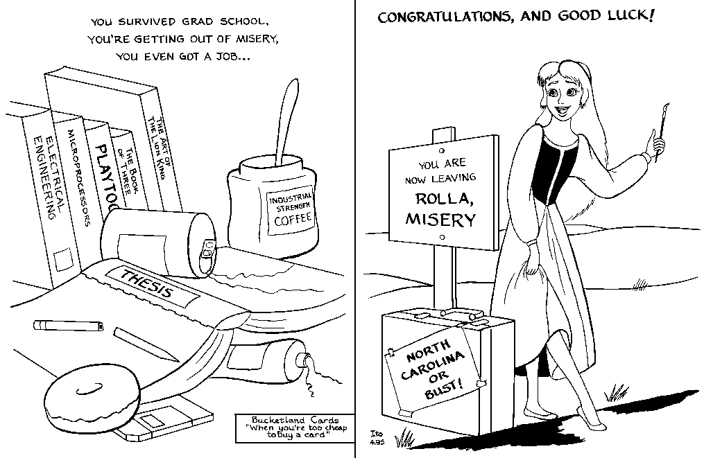 This is a handmade greeting card for David Uy <daviduy@[...]>, in honor of his getting a job and completing grad school. (Well, not quite, he's ABD right now, and will defend his Ph.D. dissertation hopefully sometime soon.) The image is divided into two main sections: