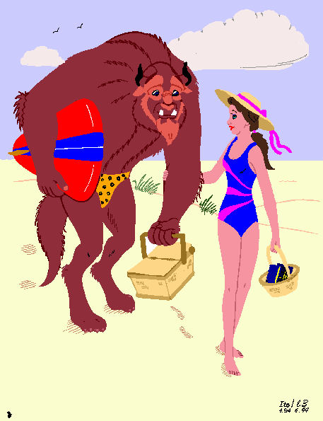 This is a colored version of Bob Ito's Disney fanart drawing "Beauty and the Beach", posted in April 1994. Special thanks to lar3ry gensch <lar3ry@[...]>, who did the electronic painting, and outfitted Beast with leopard-skin Speedos in this version. ;-)