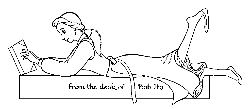 "Bob's Belle Letterhead 2" (itoltrh2.gif, 1019x444x2, 9292 bytes) is another of Bob Ito's <ito@[...]> fine Disney fanart drawings. However, it is not part of the "Ito Galleries, Inc." series of drawings, mainly because it doesn't quite manage to fit in with the series.