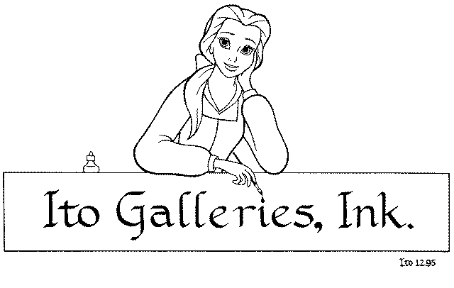 Earlier, Bob brought you two Belle drawings he used as letterheads (itoltrh1.gif and itoltrh2.gif, which are available from the Ito Galleries, Ink. website. Now, he brings you a brand new logo for the Ito Galleries, Ink. webpage, with his favorite character, Belle, looking over his work!